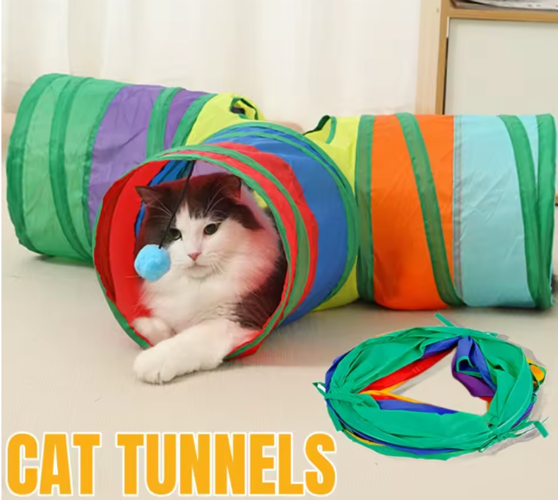 Tunnel de jeu pliable pour chat – Coloré, amusant et interactif ! Ce tunnel 3 voies stimule le jeu, réduit l’ennui et se plie facilement pour un rangement pratique. Idéal pour chats et chatons.